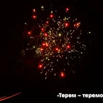 Эффекты: 1. Разноцветные кометы разрываются сферами. 2. Золотые форсы и красные огни. 3. Золотые форсы и зеленые огни. 4. Красные, зеленые мерцающие и трещащие огни. 5. Серебряные форсы , зеленые и синие огни. 6. Золотые форсы и множество золотых трещащих искр.